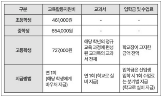 초등학생의 경우 연간 약 461,000원(연1회), 중학생은 약 654,000원(연 1회), 고등학생은 약 727,000원(연 1회)의 지원금을 받을 수 있습니다. 이러한 금액은 매년 변동될 수 있으며, 정확한 지원금액은 관련 법령에 따라 다를 수 있습니다.