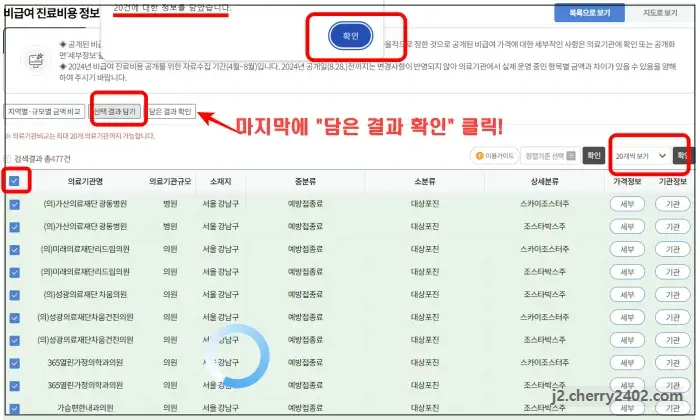 오른쪽 10개씩 보기에서 20개씩 보기 조정> 확인> 왼쪽에 작은 네모 체크> 위에 선택결과 담기 클릭! >20개에 대한 정보를 담았습니다라는 확인창이 뜹니다! > 담은결과 확인 클릭!